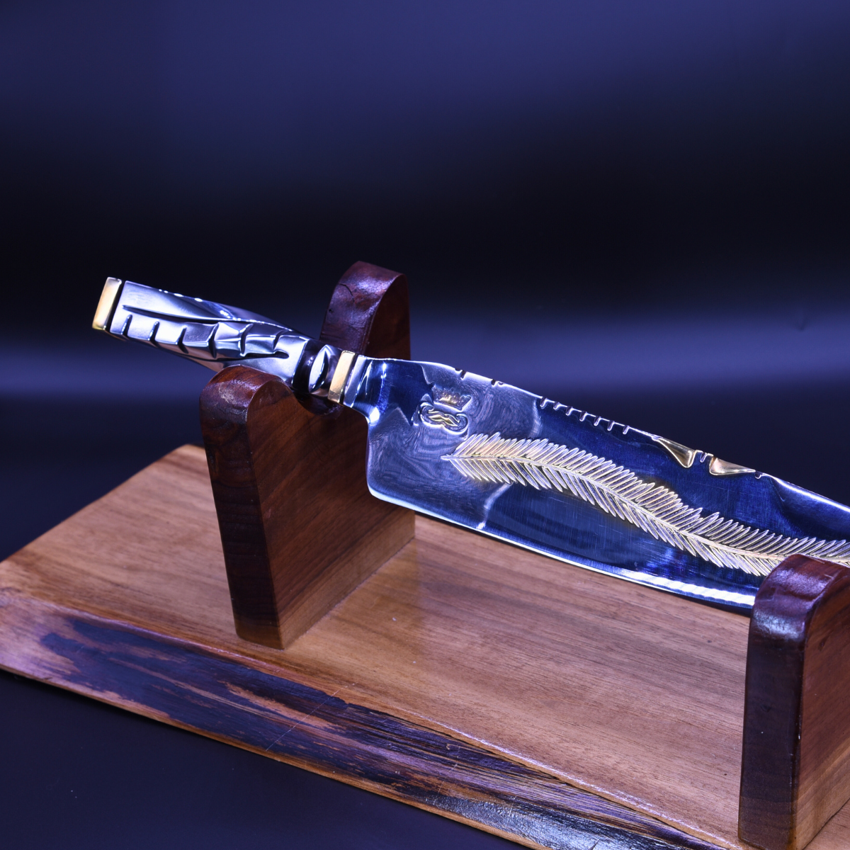 - Partial-Gold Blade – mirror polish with etched feather inlay